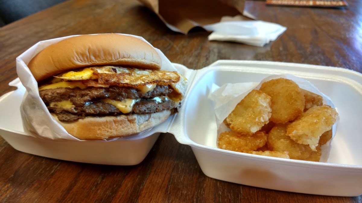 The spot is especially reliable for grabbing a substantial burger on the go — the double cheeseburger with bacon and egg stands out as a hearty choice, while breakfast sandwiches like the sausage, egg, and cheese biscuit have drawn repeat fans. Service moves quickly, aided by two drive-thru windows and an outdoor ordering window, making it easy to swing by at any time of day when hunger strikes.